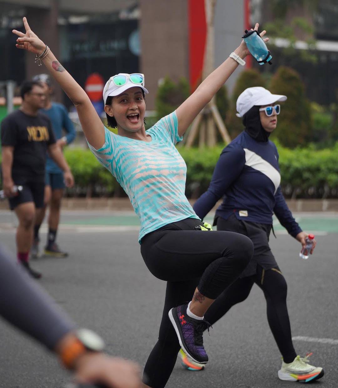 “Aku ibu rumah tangga dengan aktifitas lari yg tadinya di paksa-paksa sama suami,” akunya dengan jujur dan disertai tawa.